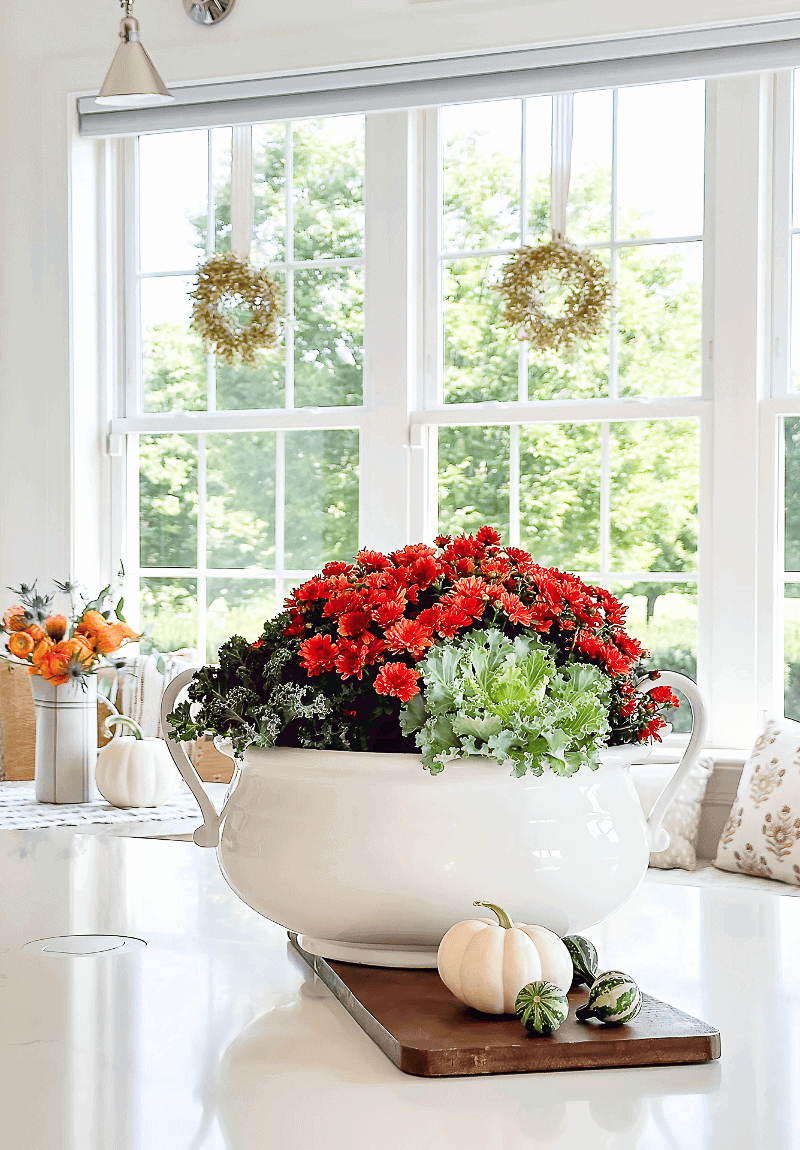 Mums and ornamental cabbages are classic fall plants that look beautiful indoors or out. Together they create a full, colorful display that feels both seasonal and timeless. Planting them in a soup tureen, ironstone bowl, or any wide container makes them easy to enjoy on a table, buffet, or porch.