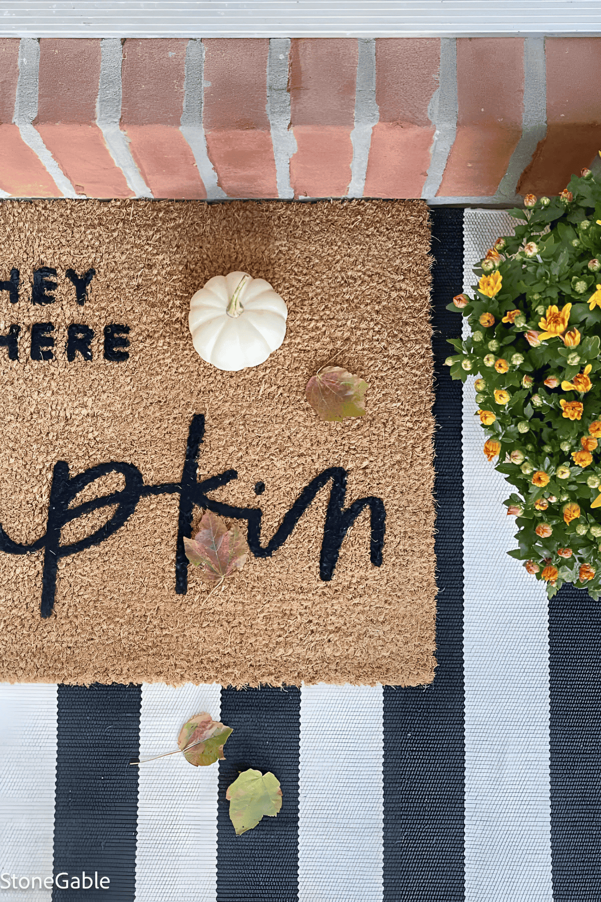 Pumpkin doormat layered over striped rug on a fall porch