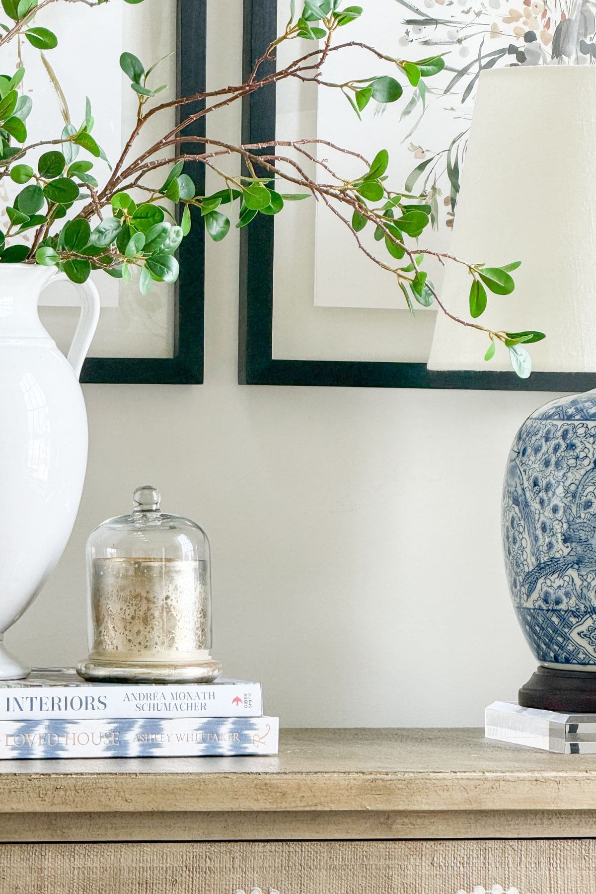 I wanted this corner of my living room to feel a little brighter and more balanced, without changing much. I added a white urn filled with faux greens and set it on a small stack of blue-covered books. On the other side of the curlicue chest sits a blue-and-white chinoiserie lamp, and together they create just enough contrast and height.