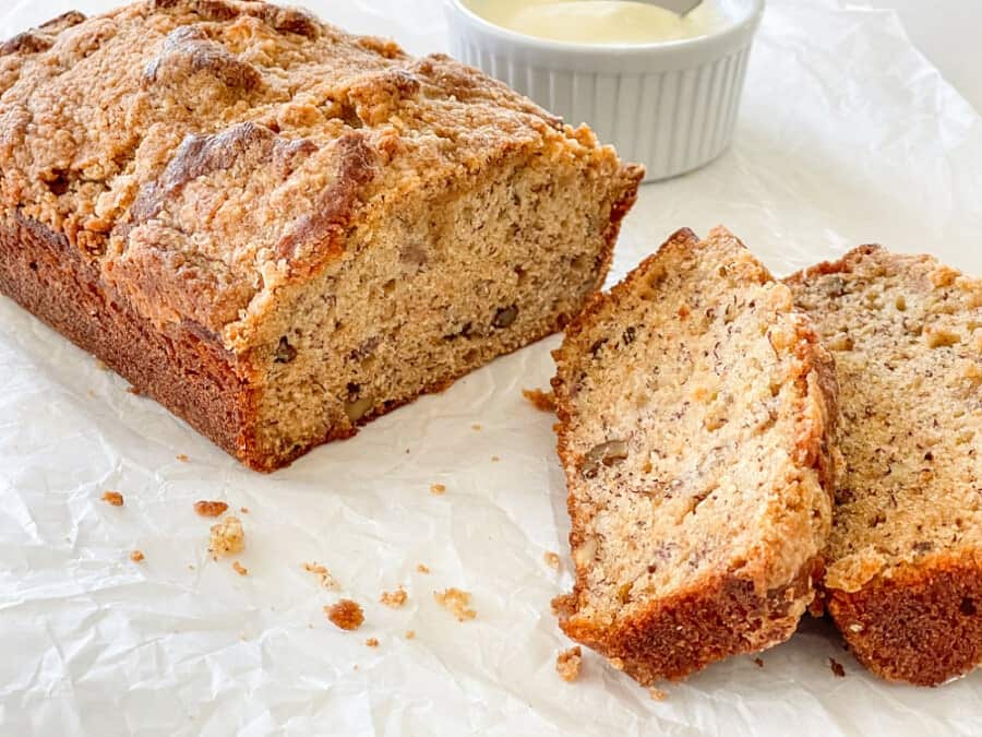 Turn overripe bananas into something truly special with this sweet dessert bread. It’s packed with banana flavor, sprinkled with nuts, and topped with a crunchy streusel. Slice it warm, drizzle with glaze, and serve it for dessert or as a sweet snack any time of day.