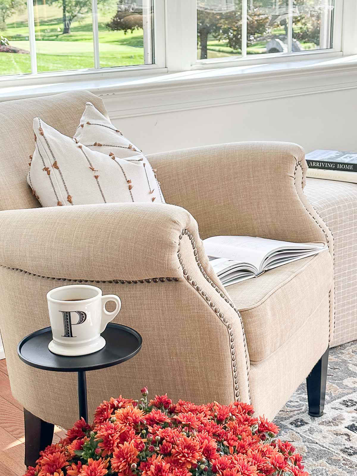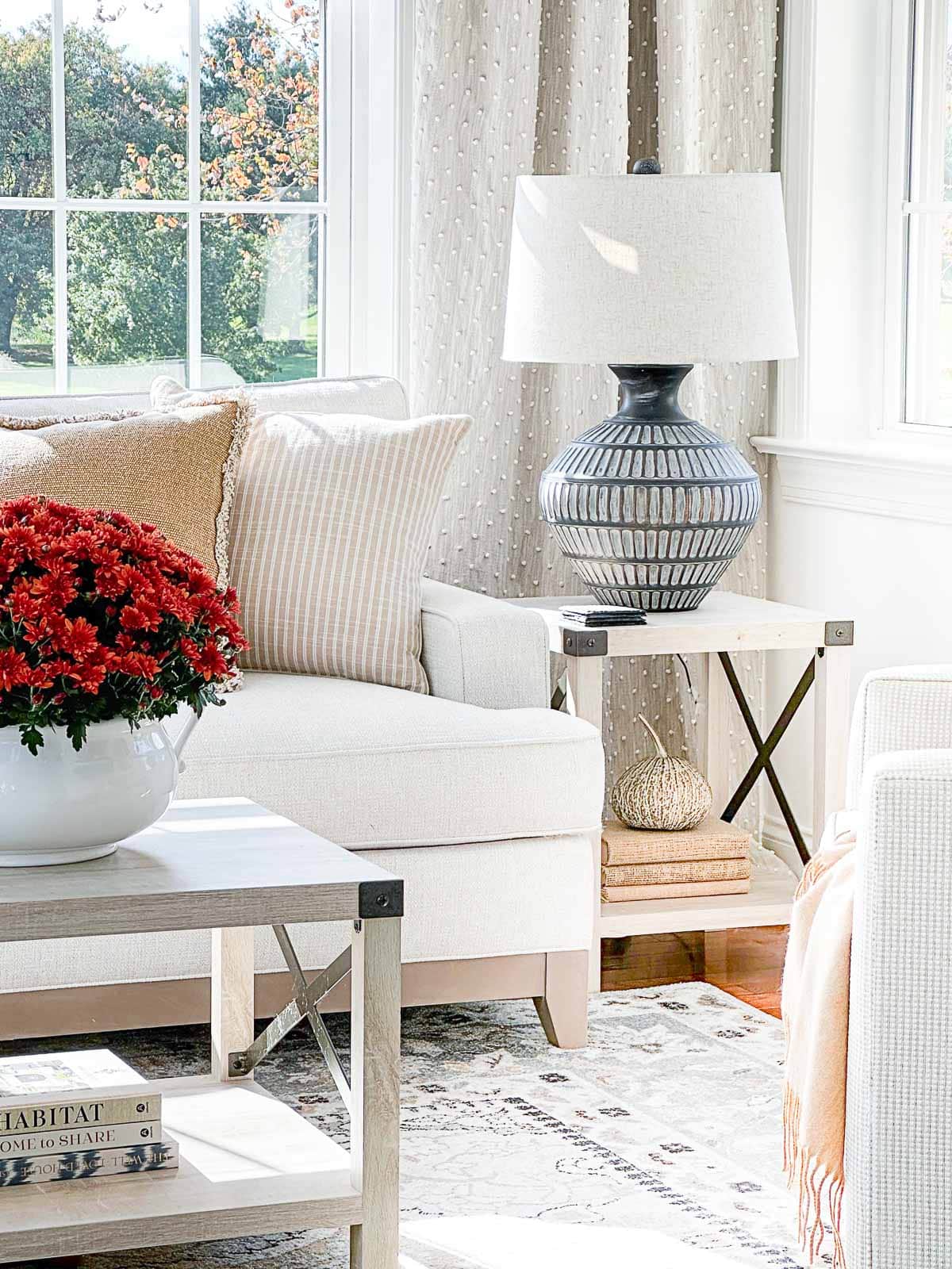 The big white pot of burnt orange mums serves as a fall organic and a pop of color. I was going to choose a burnt gold mum at first. Then decided a brighter color might look nicer. A burst of striking color against the neutral color palette of our sunroom was just what this small room needed. You might want to give this a try, too. One great color is a statement piece, giving a fun dose of fall personality to a small room.