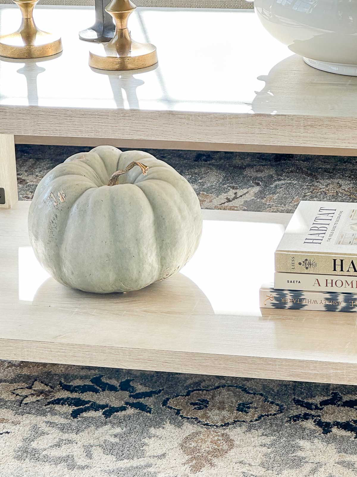 I opt for a minimal approach, using only a few fall items in our sunroom. This year, I put a green pumpkin on the shelf under the coffee table.