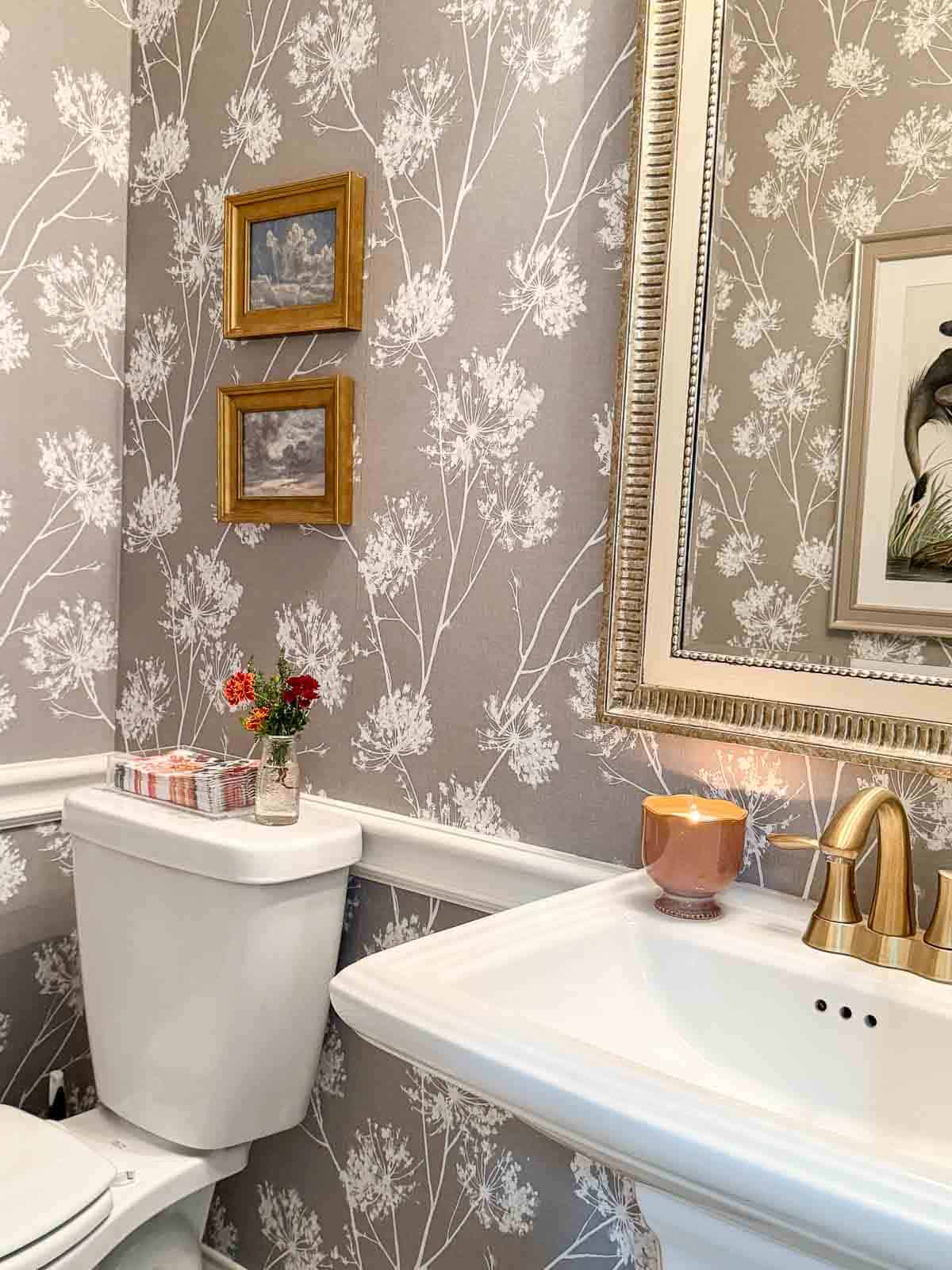 Our powder room is quite small, so I like to keep it fresh and seasonal with paper hand towels—especially since we often have family and friends stopping by. Here is a little tip for any bathroom size: a scented candle can add a lovely seasonal fragrance even when it is not lit. Once the scent begins to fade, lighting the candle for just a little bit and blowing it out will bring those wonderful aromas to life again.