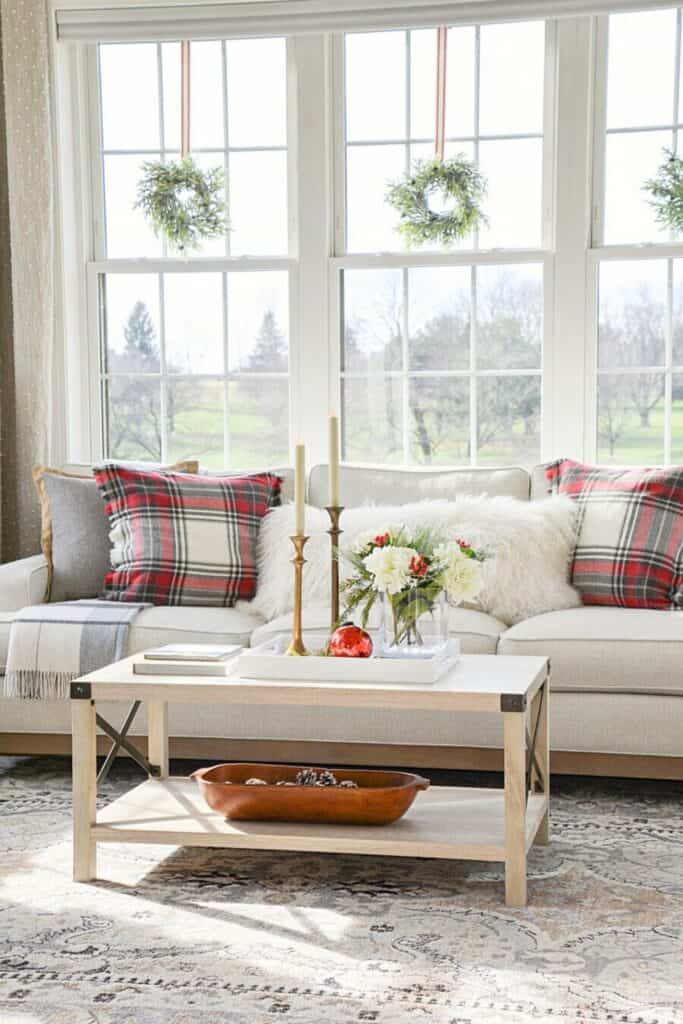 Choose a few key spaces to focus on instead of trying to decorate everything. Add greenery to a mantel or tabletop, display a bowl of ornaments, or light a few candles. Layer textures like soft throws and cozy pillows for warmth. A simple wreath, a lit tree, or a few twinkle lights can make your home feel magical without feeling cluttered.