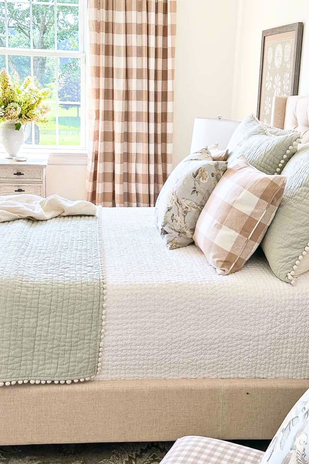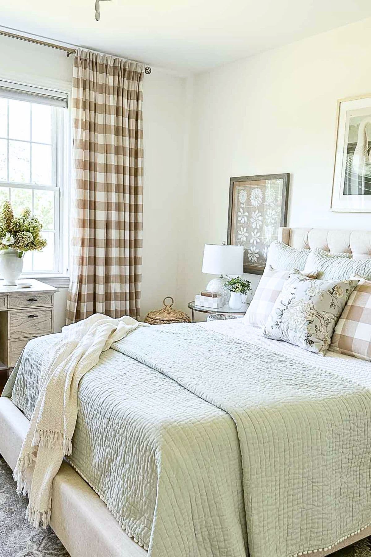 The brown buffalo check pillows are made from the same fabric as our curtains, and the middle pillow features a combination of colors found in the room. Because I use lots of warm neutrals in our home, I can easily add more pillows to our bed or change them out depending on the season or my whim.