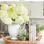 The corner of our counter is where I like to add something eye-catching. The limelight hydrangeas by our front walk have just started to bloom, and they are a very welcome part of this kitchen vignette. My number rule for creating vignettes is to put them together quickly and not to take them too seriously!
