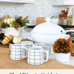 Cozy Thanksgiving buffet drink station with patterned mugs, soup tureen, fall greenery, and candles — perfect for serving hot drinks.