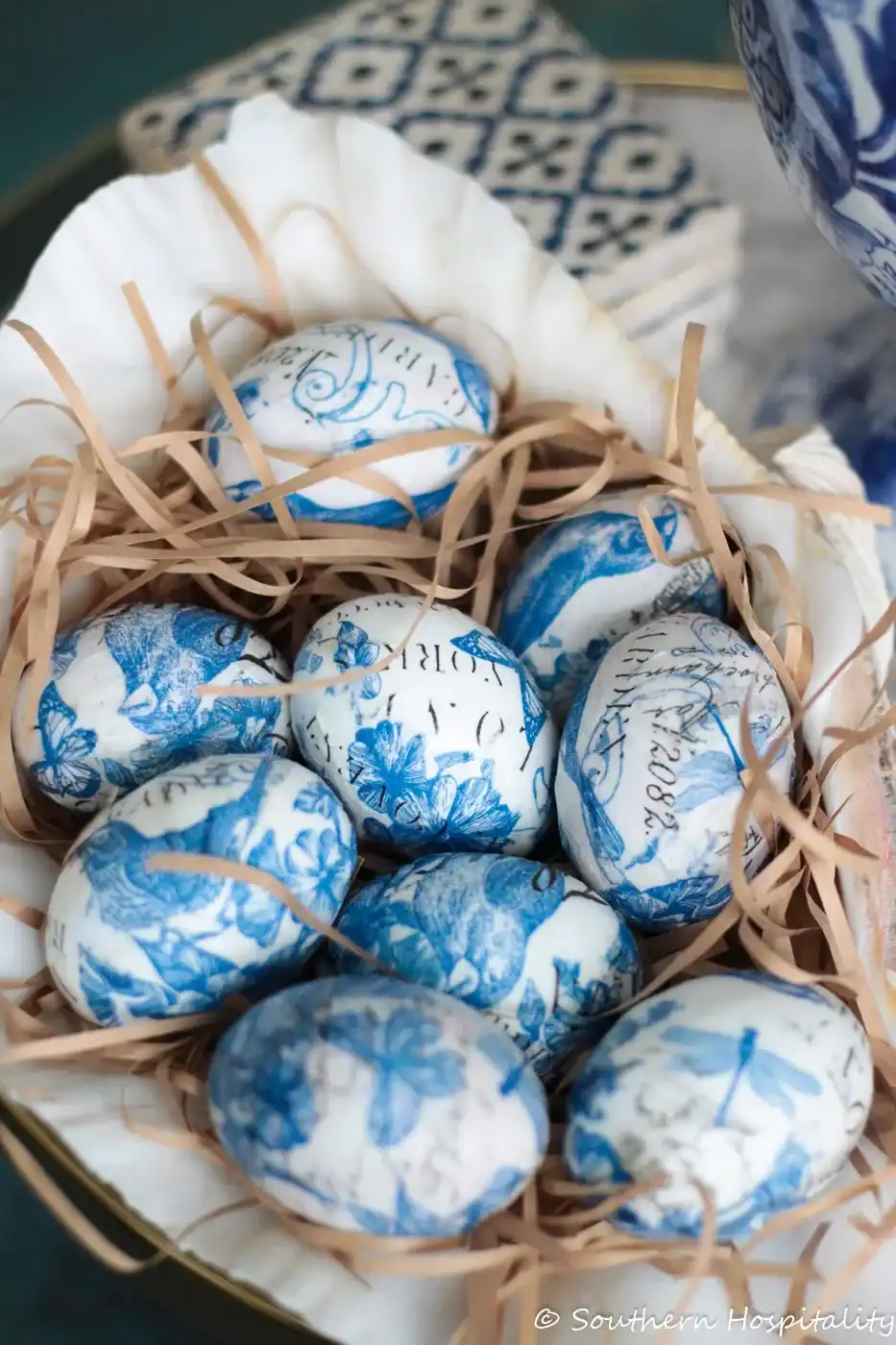 These decoupaged Easter eggs are such a charming way to bring a collected, old-world feel to your spring decor. With their delicate chinoiserie details and soft blue and white palette, they look like something you might find in a favorite antique shop and are perfect for adding a graceful seasonal touch to your home.
