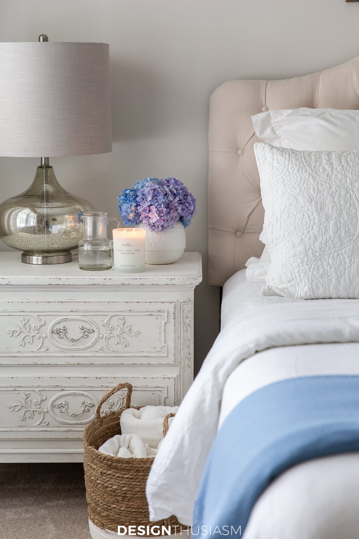 bedside table with blue hydrangeas in a white vase and a candle