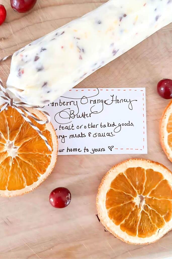 This butter makes a thoughtful and delicious handmade gift. Simply divide the recipe in half to create two smaller butter logs or fill a small jar. Write a handwritten tag with the butter’s name and a few ideas for how to use it. I tied the tag, along with a dried orange slice, to one end of the log using baker’s twine for a festive touch. A few of our neighbors will be receiving this, paired with a small loaf of bread, for Christmas.
