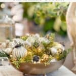 This pretty little gold bowl filled with ornaments, fairy lights, and bits of faux greens is an easy way to add Christmas to any room. Here’s how to make one of your own.