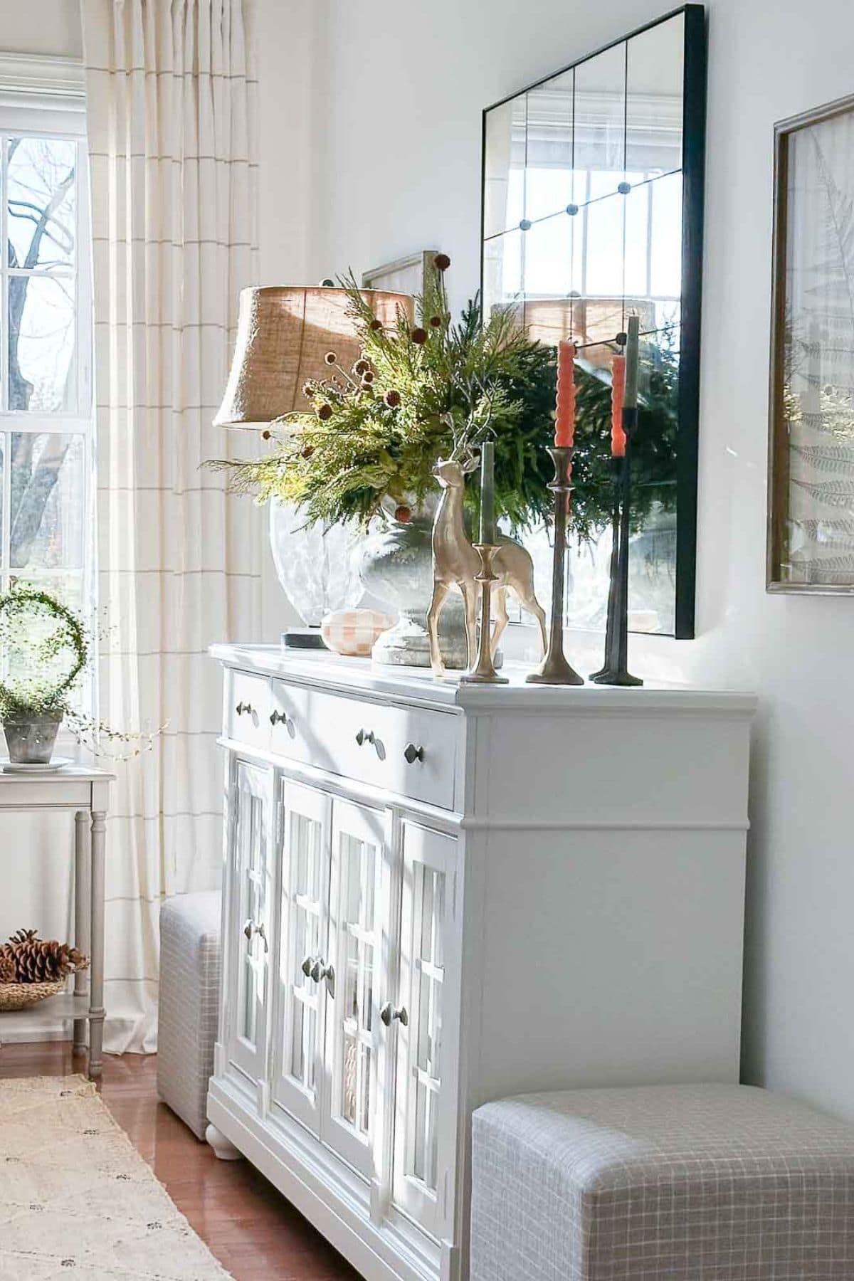 Don’t be afraid to cut garlands or stems apart. I save every little piece because they’re perfect for tucking into trays, wreaths, lanterns, and small vignettes.