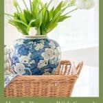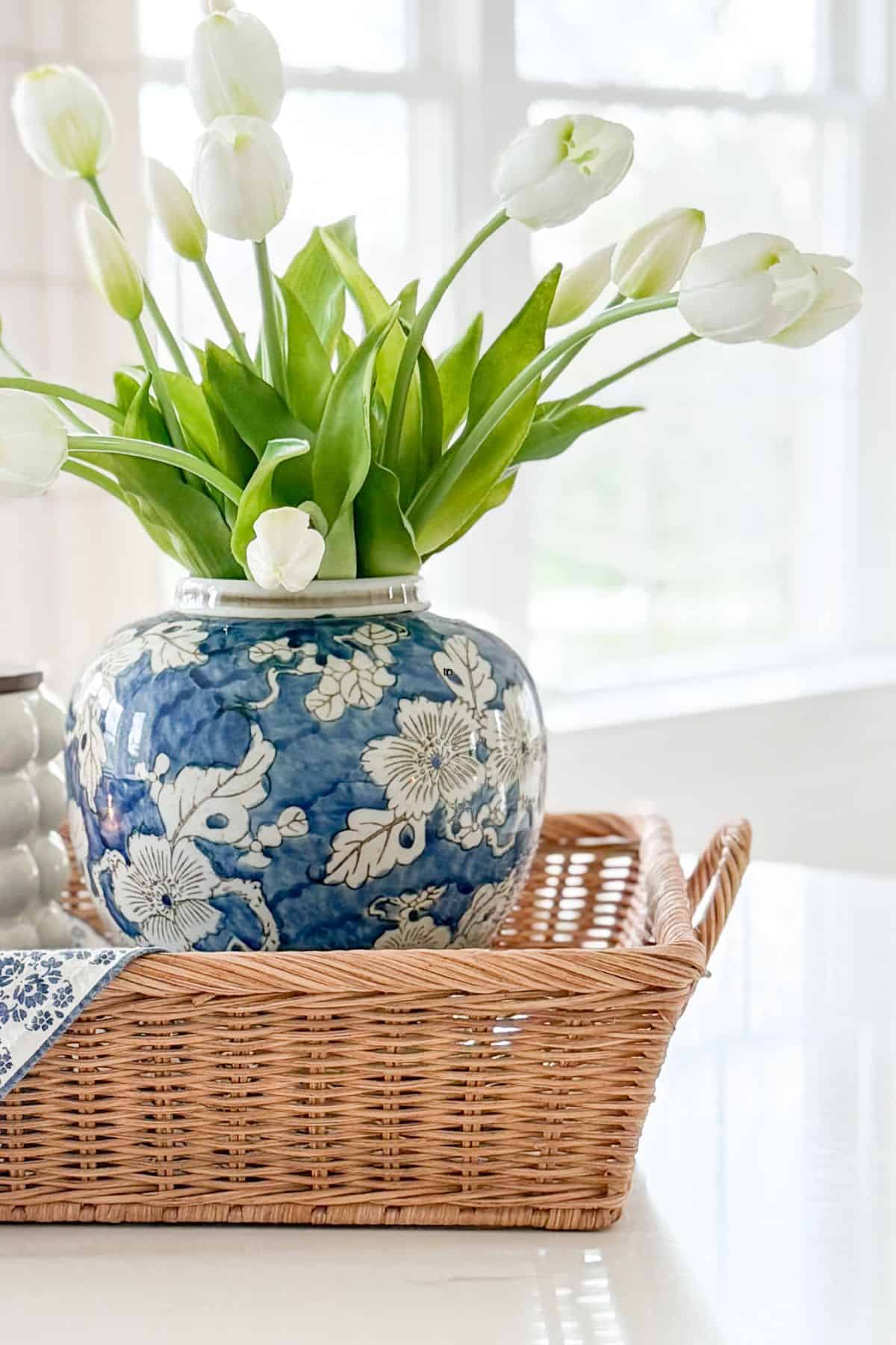 a blue and white ginger jar with white tulips and bright green stems and leaves in a basket