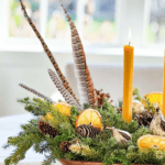 I believe this dough bowl could easily work as a Thanksgiving centerpiece in November. With Christmas falling later this year, I love including pheasant feathers for a Thanksgiving touch. It’s the perfect November through December accent!
