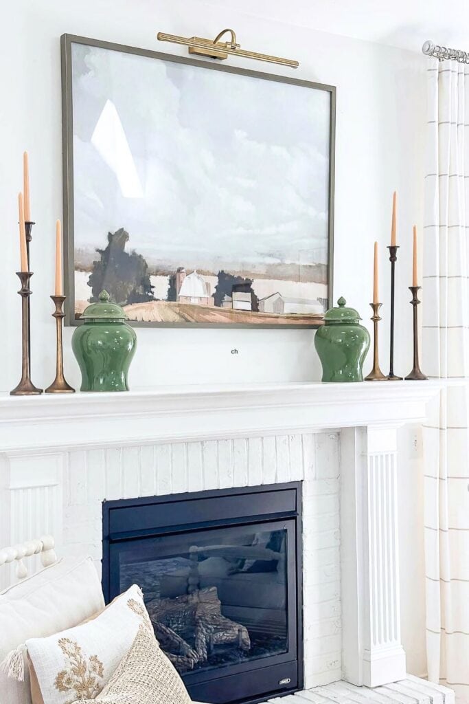 Our living room actually has two focal points. One is the fireplace and mantel, which is a natural architectural element in the room. It’s painted the same soft white as the walls, so it gently blends in and doesn’t demand too much attention. The other is a white buffet with a mirror above it, which I often decorate with lamps and seasonal touches. Because the buffet draws more attention, we keep the mantel very simple. We hung a calm, neutral piece of artwork above it and usually style it with just a trio of candlesticks and candles. This keeps the room feeling balanced and lets both focal points work together without competing.