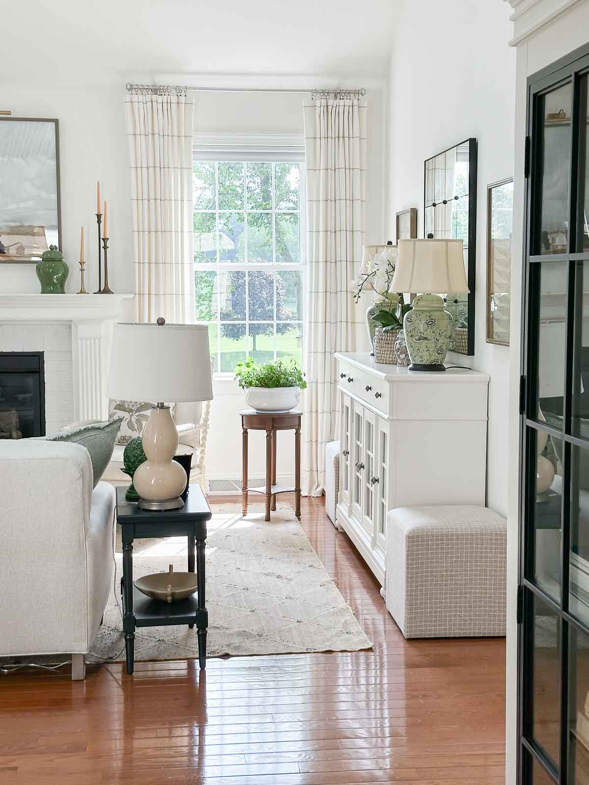 Our living room actually has two focal points. One is the fireplace and mantel, which is a natural architectural element in the room. It’s painted the same soft white as the walls, so it gently blends in and doesn’t demand too much attention. The other is a white buffet with a mirror above it, which I often decorate with lamps and seasonal touches. Because the buffet draws more attention, we keep the mantel very simple. We hung a calm, neutral piece of artwork above it and usually style it with just a trio of candlesticks and candles. This keeps the room feeling balanced and lets both focal points work together without competing.