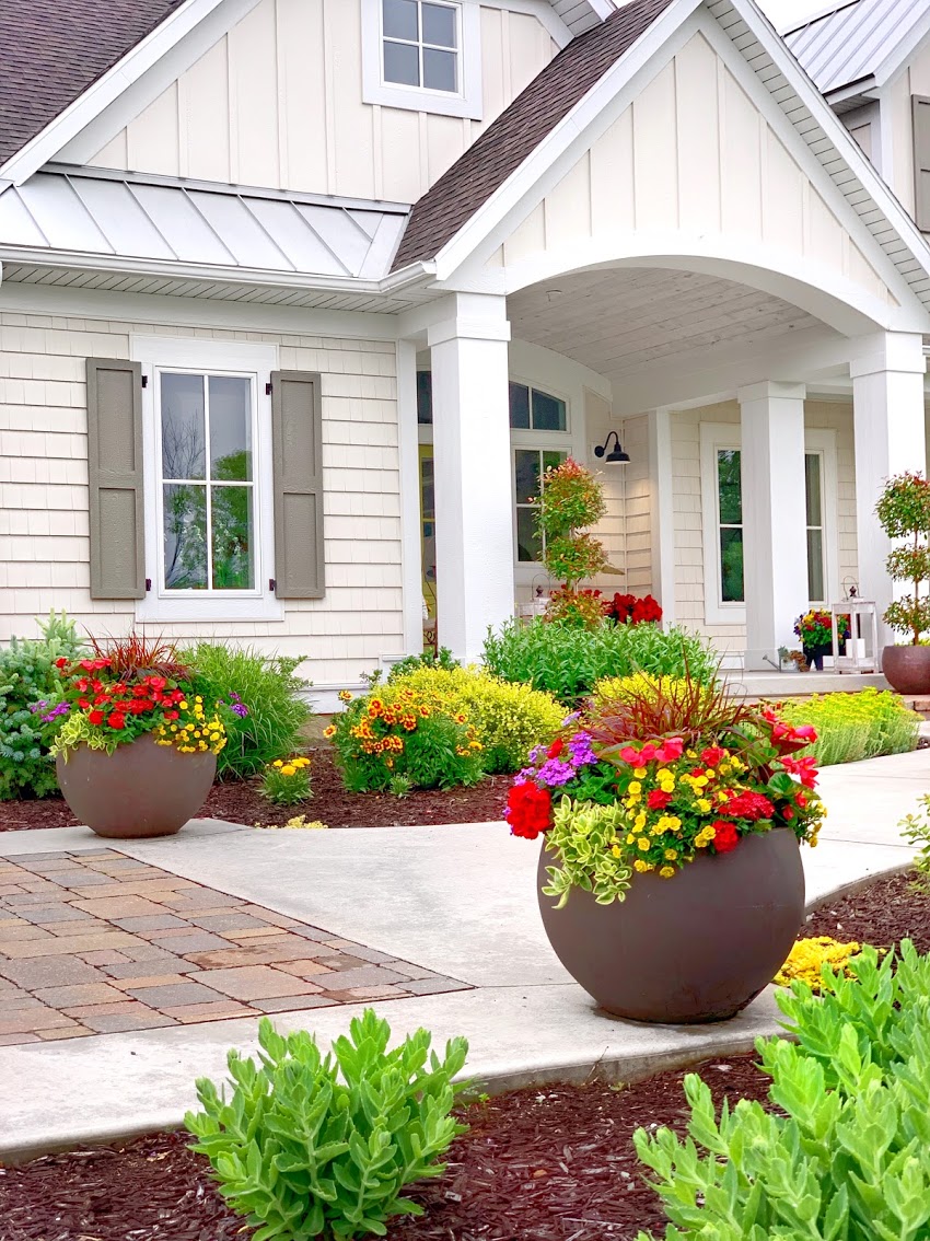 white home with a colorful garden