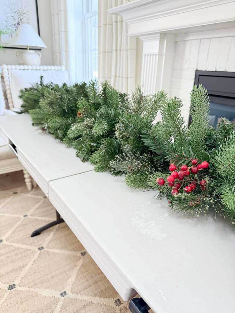 Doubling the garlands gives you a fuller base and a nice amount of lights running through the whole length. I placed both garlands on a utility table to twist them together. Doing this on the mantel can feel a bit cumbersome, and the table makes the job simple and easy to manage.