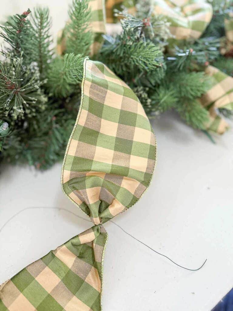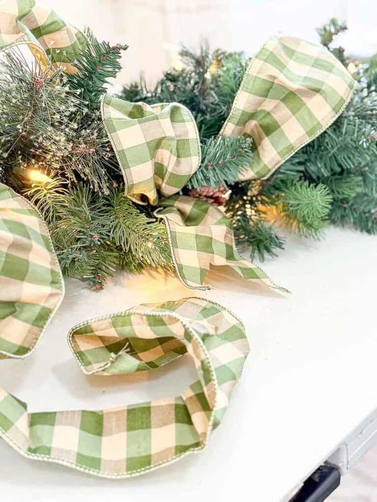 While the garlands were on the table, I added a base layer of buffalo check ribbon loops. I cut the ribbon into two-and-a-half-foot lengths and cut one-foot pieces of floral wire. Then I pinched the ribbon at one-foot intervals and wired each pinch to hold the shape. After that, I wired the ribbon to the garland, creating loose loops that sit softly atop the greens.
