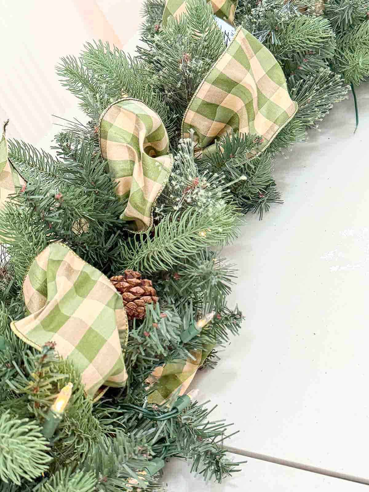 While the garlands were on the table, I added a base layer of buffalo check ribbon loops. I cut the ribbon into two-and-a-half-foot lengths and cut one-foot pieces of floral wire. Then I pinched the ribbon at one-foot intervals and wired each pinch to hold the shape. After that, I wired the ribbon to the garland, creating loose loops that sit softly atop the greens.