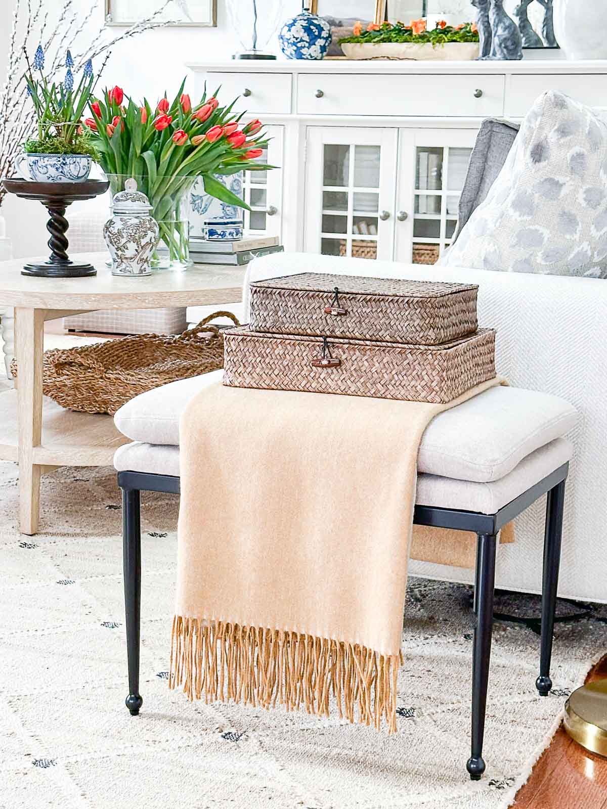 - Use a basket to quickly gather up clutter before company arrives. It’s one of my favorite tricks!