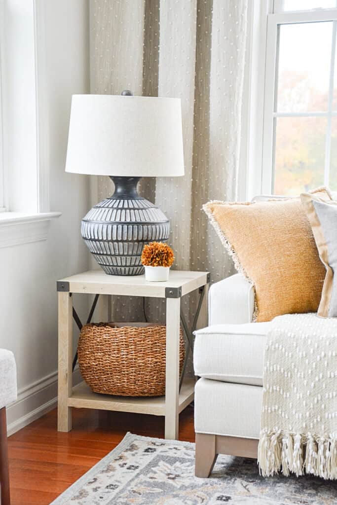 - Collect throw pillows or seasonal blankets in a deep basket beside the sofa.