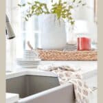 One of my favorite tricks for keeping countertops looking neat and intentional is using trays or baskets to corral small items. A pretty tray can hold a soap dispenser, a scrub brush, and a candle near the sink, while a lazy Susan or tray can gather oils, salt and paper shakers, and other seasonings near the stove. This keeps everything looking organized and attractive instead of cluttered.