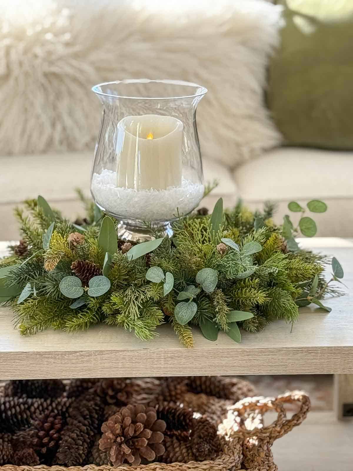 Lay your wreath flat on a table or large tray. It becomes a pretty candle ring that adds Christmas charm to a dining table, kitchen island, or coffee table.