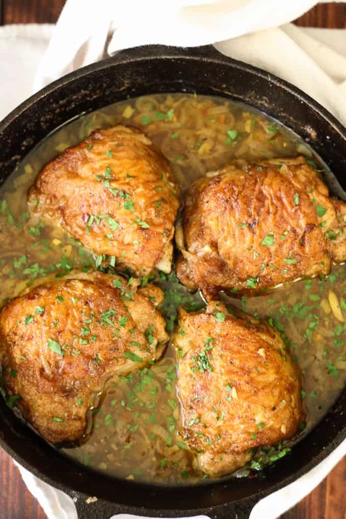 This skillet chicken with garlic, shallots, and wine sauce is the kind of recipe that makes dinnertime feel extra special without a lot of extra work. The chicken is seared until golden, then gently simmered in a rich, fragrant sauce made with sautéed shallots, tender whole garlic cloves, white wine, and just the right touch of stock to bring it all together.