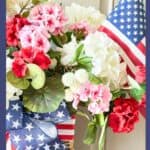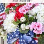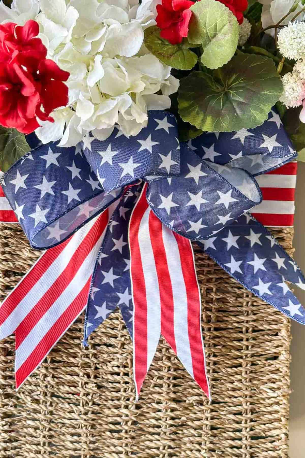 I repurposed some of the elements in the basket along with red, white, and pink florals from my stash in the basement into a festive patriotic design. This is such an easy and budget-friendly way to create something beautiful for your front door.