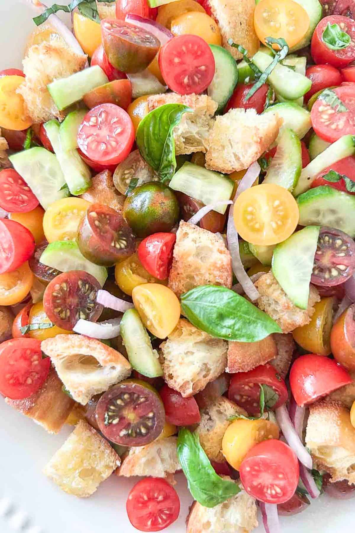 Turn stale or day-old bread into a delicious Panzanella Salad with fresh summer veggies and a bold, tangy vinaigrette.