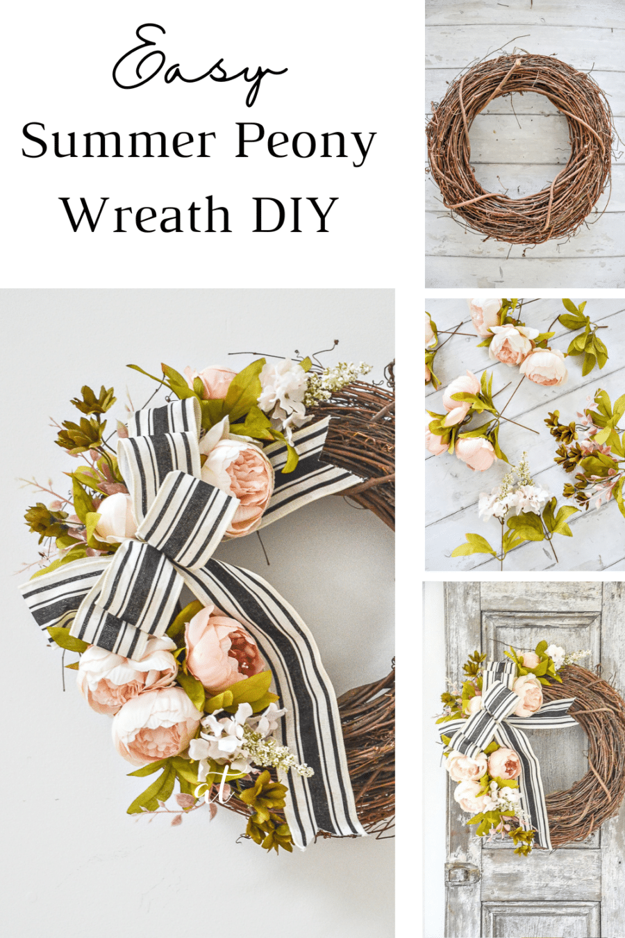 This wreath is so simple to make! I found a small bouquet of silk peonies on Etsy and did not need to add any other flowers.
