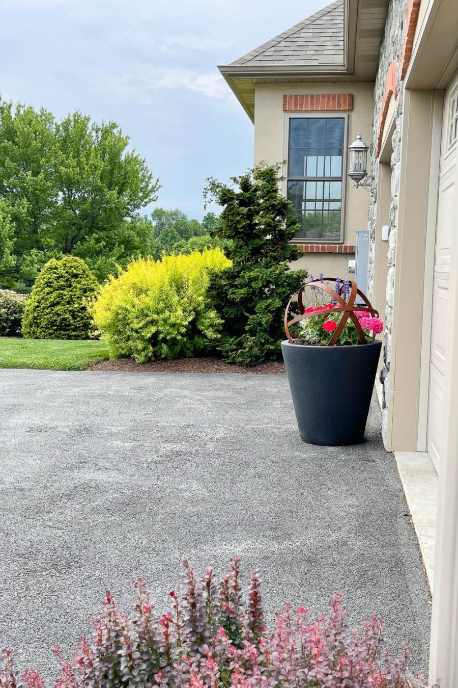One good way to break up all the driveway blacktop is with a big pot of colorful summery flowers!