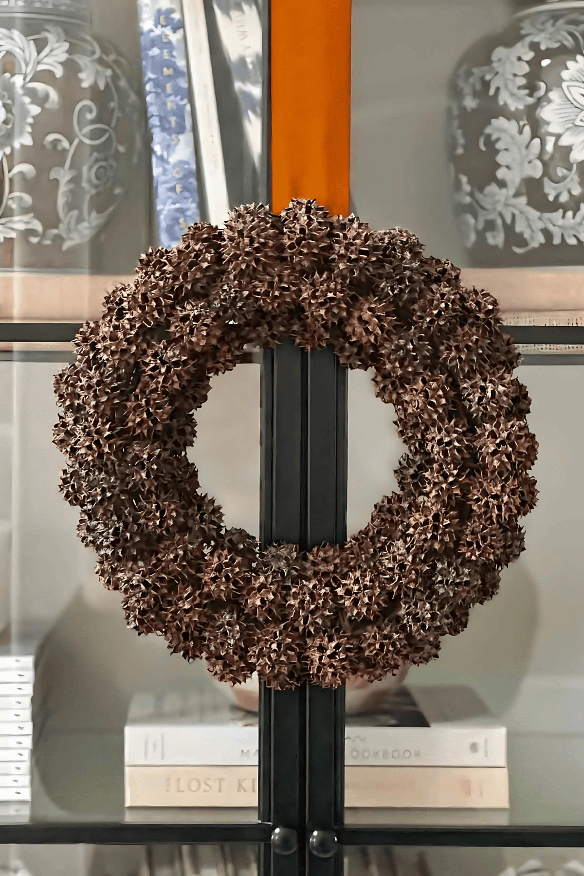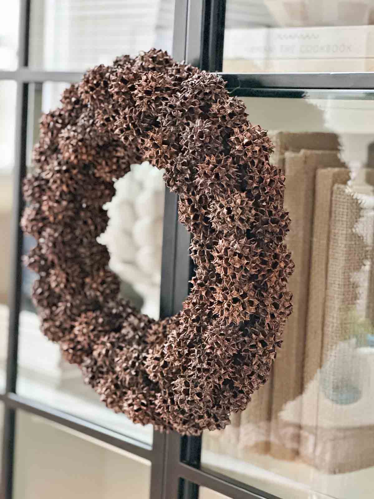 SWEET GUM BALL WREATH ON ON THE FRONT OF A GLASS BOOKCASE