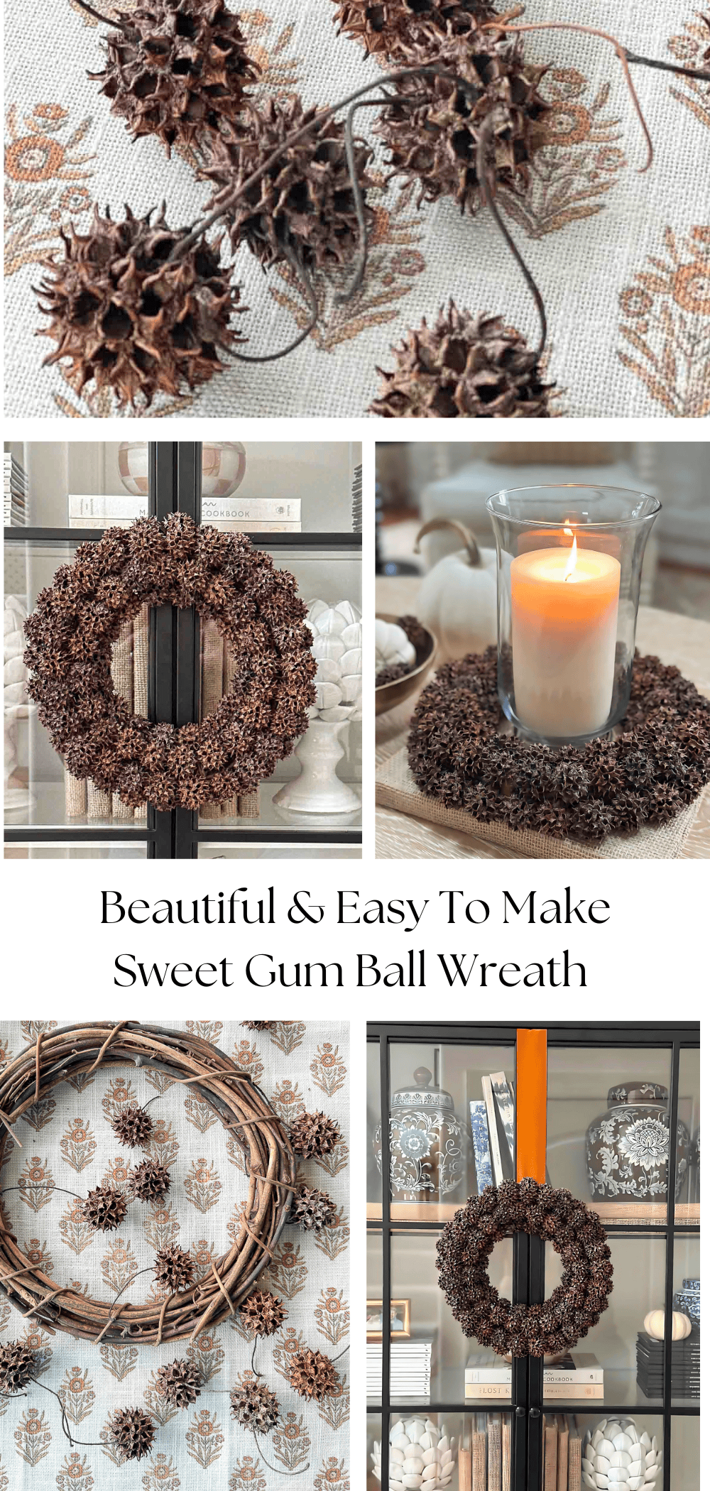 Besides being easy to make, the best word to describe this wreath is handsome. A sweet gumball wreath looks high-end, rich in textural detail, and impressively stately. I came across several attractive wreaths and knew I had to make one for our fall home. This is a simple fall DIY you will want to make so you can enjoy using it in your home through Christmas.