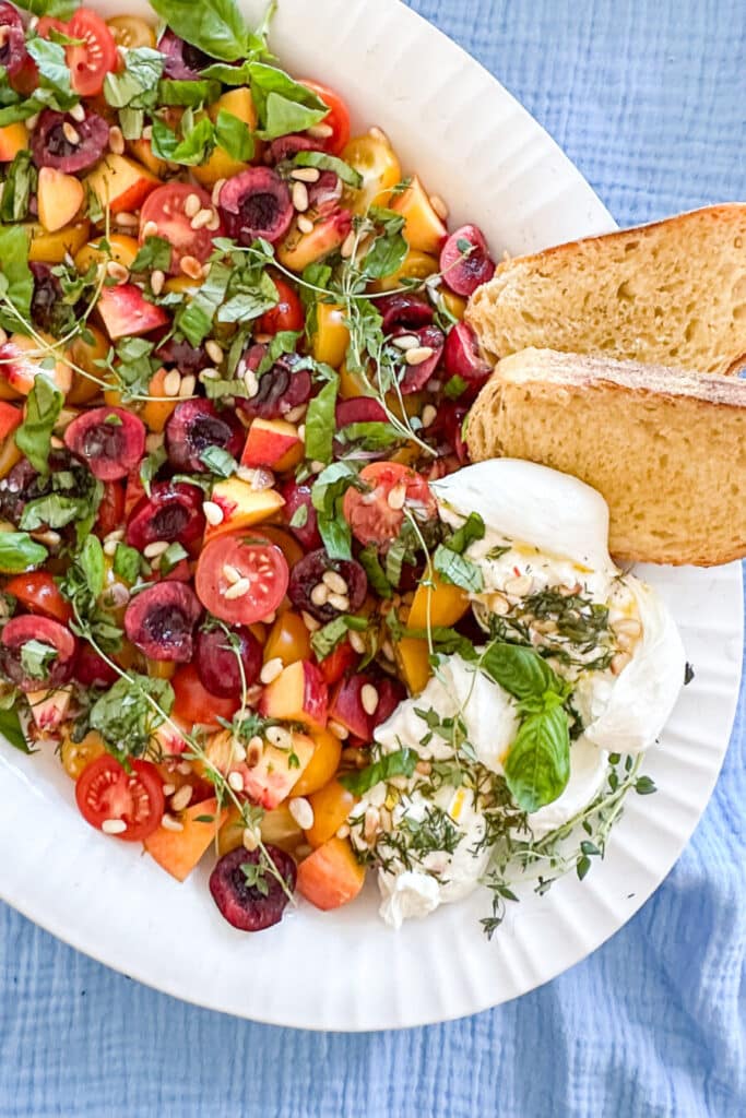 Tomato, Peach, Cherry, and Burrata Salad with Herb Vinaigrette – Juicy tomatoes, sweet fruit, creamy burrata, and fresh herbs.