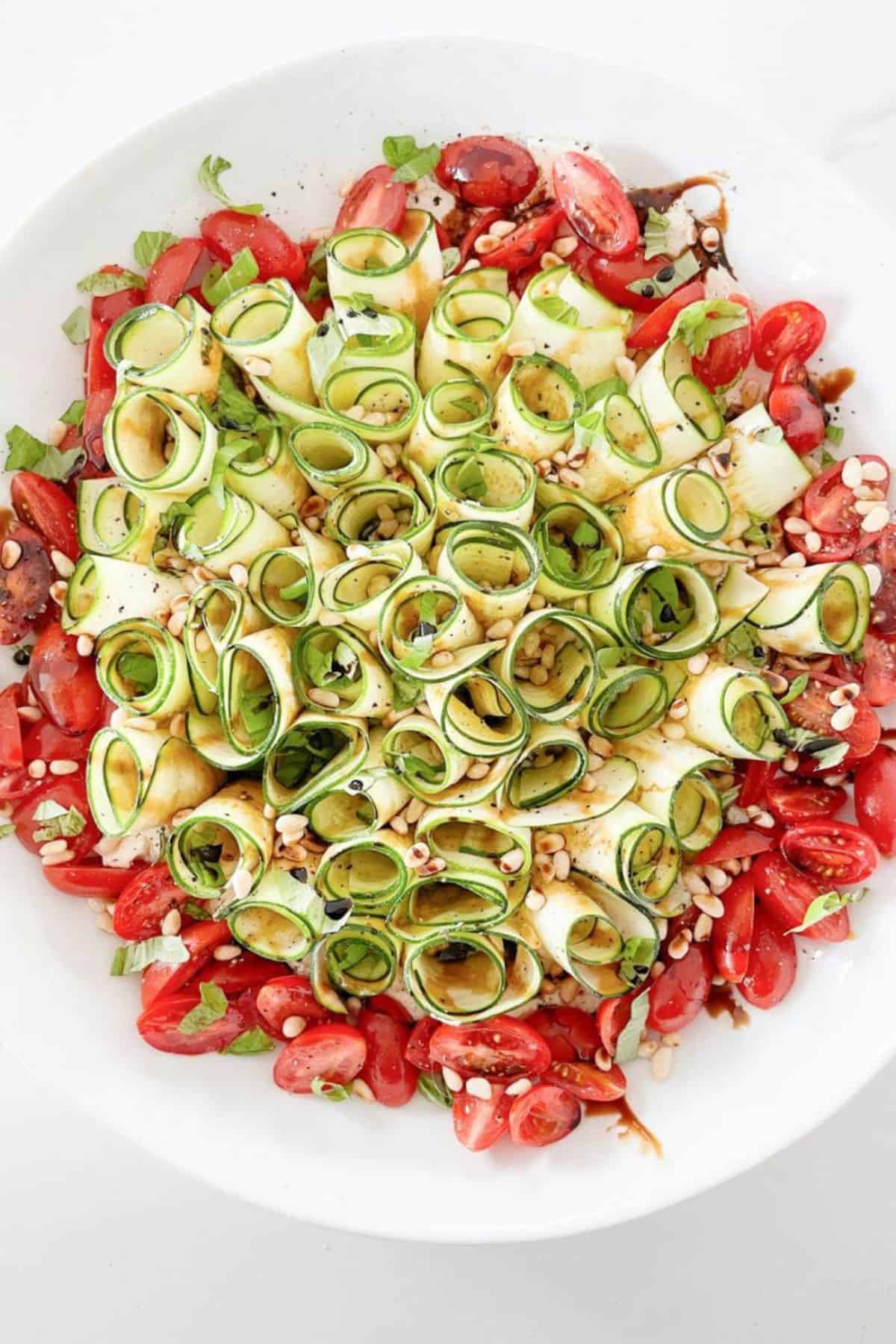 Show Stopper Zucchini Ribbon Salad with Balsamic Glaze – Tender zucchini ribbons drizzled with balsamic glaze.