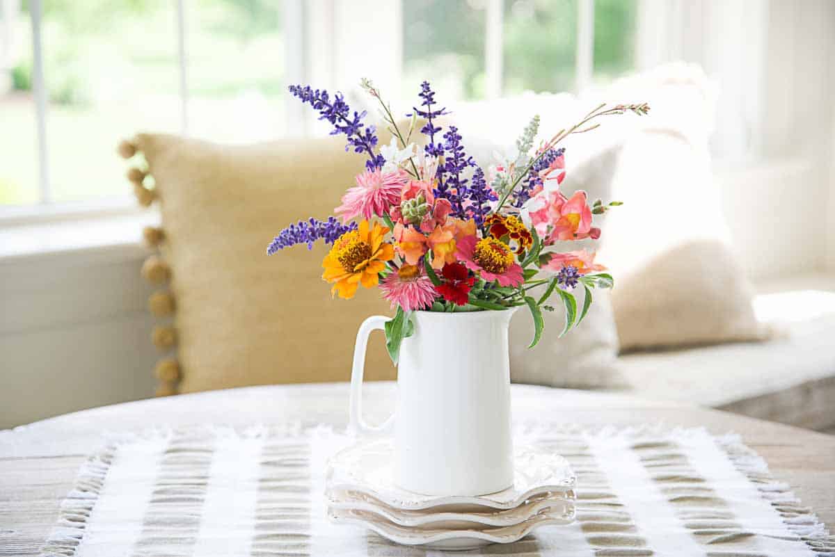 GARDEN FLOWERS IN A PITCHER ON A TABLE