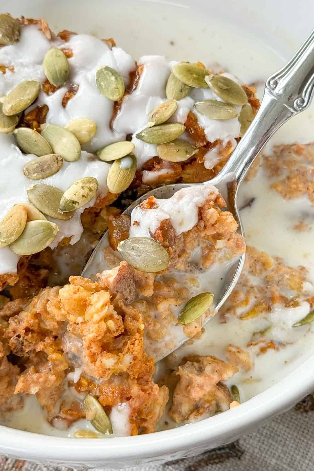 It’s part oatmeal, part bread pudding, and completely satisfying. You can enjoy it plain or topped with a vanilla drizzle, yogurt, maple syrup, or toasted nuts.