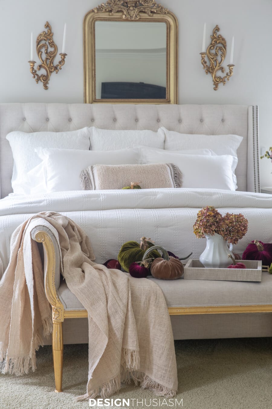 French bed with a bench with velvet pumpkins and dried hydrangeas
