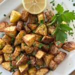 Put the potatoes on a plate or in a bowl. Salt and pepper to taste. Squeeze half of a lemon over the potatoes and garnish with herbs.