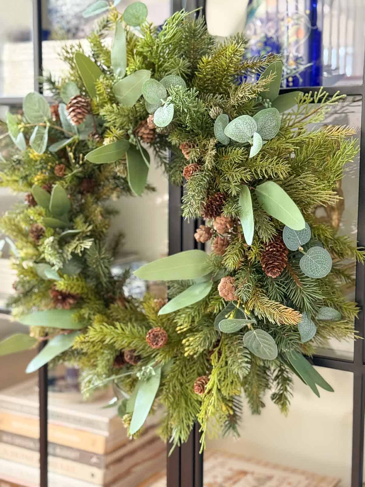 Christmas wreath hanging on glass doors